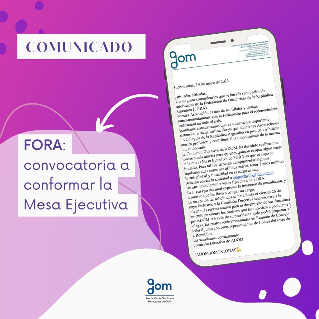 La Comisión Directiva de ADOM, ha decidido realizar una convocatoria abierta para quienes quieran ocupar algún cargo en la nueva Mesa Ejecutiva de FORA ya que el cupo es limitado. Para tal fin, deberán cumplimentar algunos requisitos tales como ser afiliada activa, tener 2 años mínimo de antigüedad y titularidad en el cargo actual.